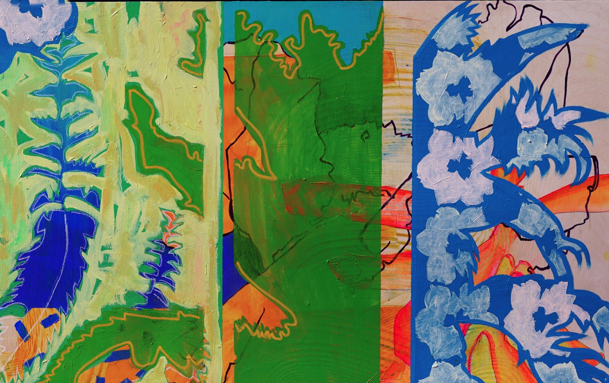 "Verdant Prism" is a celebration of the layered vibrancy of Dolores Park on a sun-drenched day. In this work, architectural elements weave together with the dense textures of flora, creating a tapestry of shapes, patterns, and light. The composition is maximalist in style, reflecting the energy and individuality of the people who gather in the park, each contributing their own color, movement, and personality to the scene. Light and color intermingle across the layers, reflecting the exuberance and individuality of everyone who fills the park.